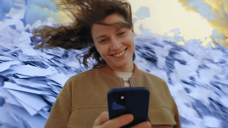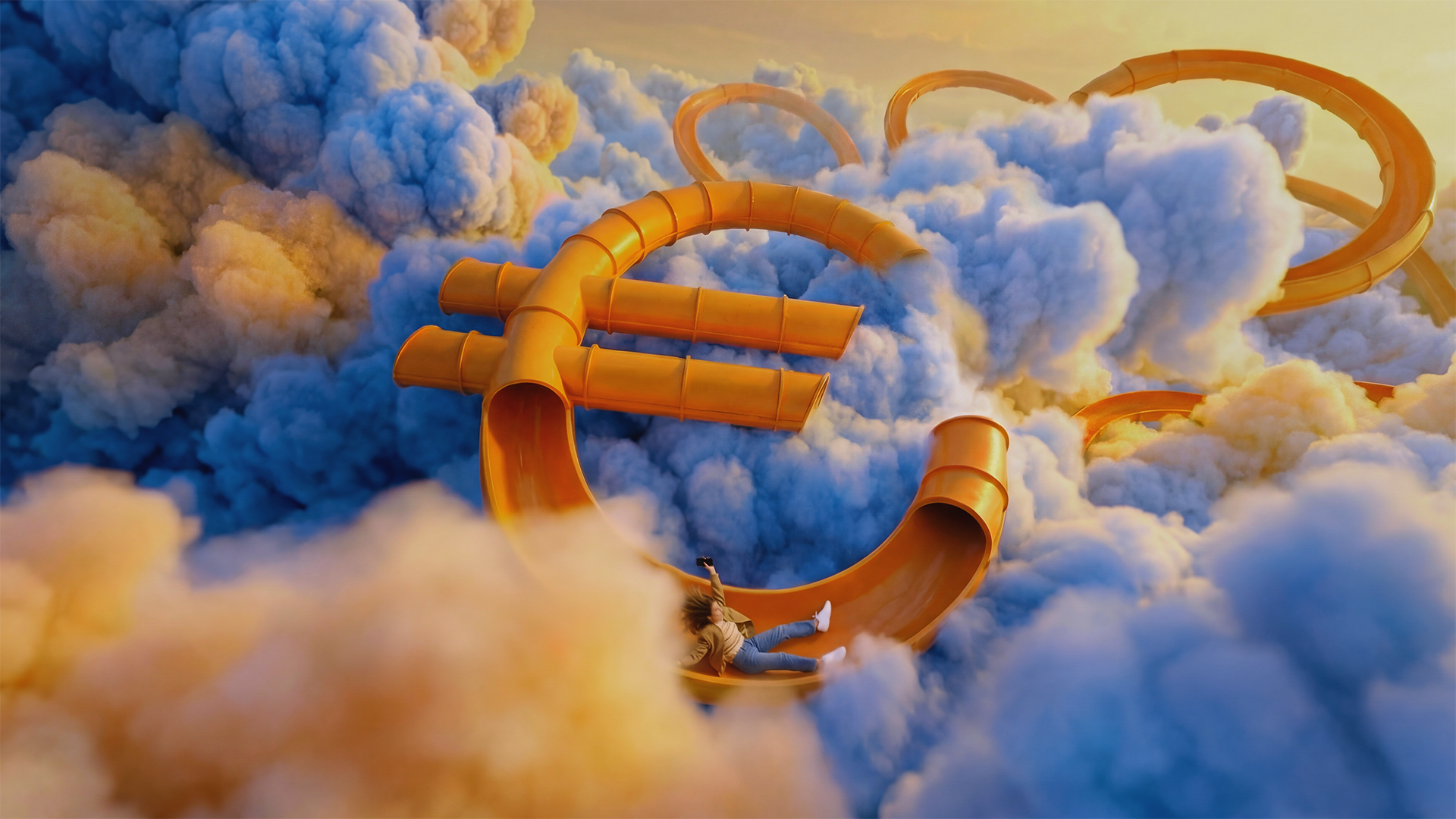 Emotionale Bildsprache: Dynamische Szenen wie das Rutschen durch eine Wolkenlandschaft in Form eines Euro-Zeichens symbolisieren die Befreiung von der Steuerlast und die Vorfreude auf die Erstattung.